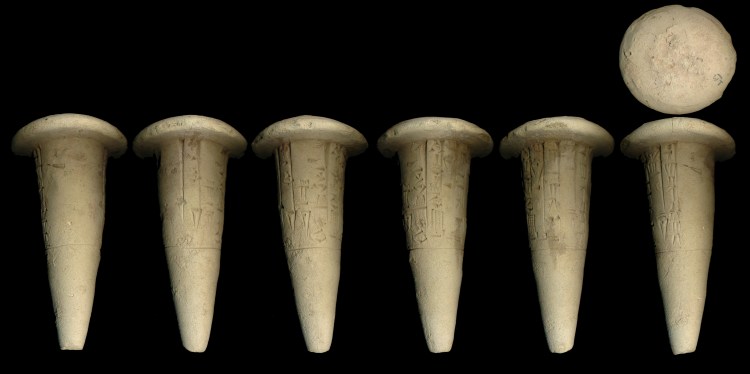 泥钉是古代两河流域建筑中非常有特色的一种构件,它一般形似圆锥或圆柱,其主体会被嵌在砖块之间,砌入建筑物墙体内,仅留下钉帽露在外面。因此,书写在泥钉钉部的铭文和泥砖上的铭文一样在正常情况下是无法被看到的。和泥砖类似,泥钉上的铭文通常也是君主在修建神庙时对于神明的奉献之辞,其作用类似于今天有时会镶嵌在建筑物墙面上的纪念性基石。除泥钉外,也有陶制、石制或金属制的钉子。有时钉子上并没有铭文,但在钉帽上会加以彩绘等,以此作为墙面装饰的一部分。本文编译的是拉加什第二王朝的著名统治者古地亚在修筑神庙时使用的泥钉(NBC 6066)上的铭文。带有相同铭文的泥钉共计出土了超过三十五件。这篇铭文被选为康拉德·福尔克(Konrad Volk)所著《苏美尔语文选》(A Sumerian Chrestomathy)的第二篇。本文在编译原文之外附上了语法分析供苏美尔语初学者参考。阅读《苏美尔语文选》中的其他内容,请移步《苏美尔语文选》学习辅导页面。