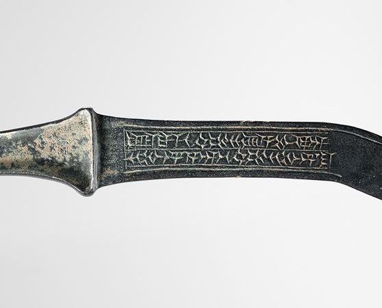 本文编译的铭文来自于一件中亚述时期的青铜弯刀,其刀身弯曲部分的外侧为刀刃,内侧为刀脊。这种形制的弯刀在古代近东地区有着悠久的历史:在雕刻于公元前三千纪中期的“兀鹫石碑”的浮雕中,拉加什城主埃阿那吞手中就握着类似的弯刀;相应的实物亦被发现于叙利亚、安纳托利亚和埃及。早期这种弯刀刀身弯曲的部分较短,弯曲程度更大,因此在使用上更接近斧钺一类的兵器。本文介绍的这件弯刀铸工优良,装饰精美,并刻有国王的名号,因此人们相信,这并非实战兵器,而是一种象征统治权柄和君主威严的仪仗兵器。刀身上的铭文也出现在数件出土于亚述城王宫遗址的石板和烧制泥砖上。
