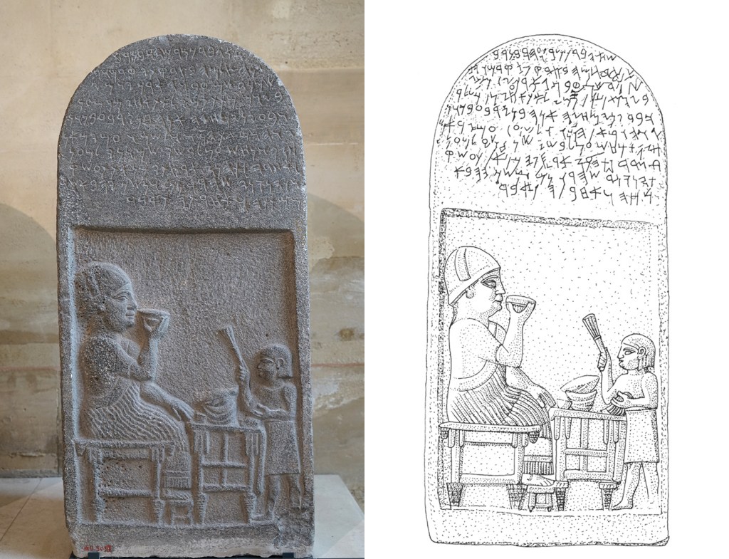 本文介绍的是一位月神祭司的墓碑。墓碑正面上方共有十行碑文,其中特别强调了在墓中没有贵重的随葬品,希望以此避免被盗掘。碑文下方刻有浮雕,表现的是墓主歆享供奉饮食的场景:他端坐在左侧的高椅之上,右手举杯欲饮,左手垂放在膝上,中间的桌上摆着盛有食物的碗和酒杯,桌子右侧还立着一个正扬起手中拂尘的仆人。